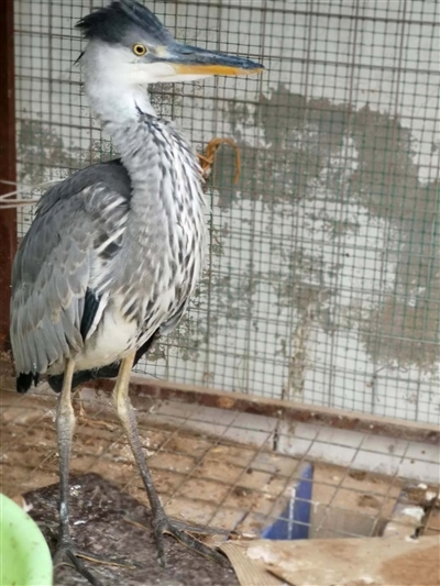 經(jīng)有經(jīng)驗(yàn)的民警辨認(rèn),這是一只蒼鷺幼鳥。這只鳥身高約70公分,長(zhǎng)長(zhǎng)的尖嘴,身著灰色體羽,頭戴深灰色羽冠,兩條大長(zhǎng)腿格外顯眼,白色的前頸縱向排列著黑灰色條紋。民警聯(lián)系獸醫(yī)為其做了體檢,經(jīng)檢查,這只鳥并無傷病,可能是由于剛出窩飛行能力不強(qiáng)、捕食能力不足,造成體力虛弱。民警買來小魚,只見這只鳥狼吞虎咽享用起來,不久便精神十足,開始啄民警。看到它體力開始恢復(fù),民警懸著的心也就放下了。民警計(jì)劃選擇合適時(shí)間和地方將其放飛。