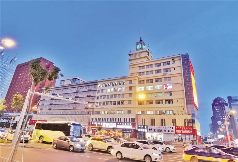 當(dāng)日傍晚時(shí)分,天色漸暗,華燈初上,在斑斕的霓虹燈中,街道車水馬龍,人群熙熙攘攘,一派繁華都市的景象。這座建于1983年的景觀塔鐘,依然和30多年前一樣屹立在新華廣場東側(cè)的信息大廈樓頂,再次以“地標(biāo)”姿態(tài)工作起來。