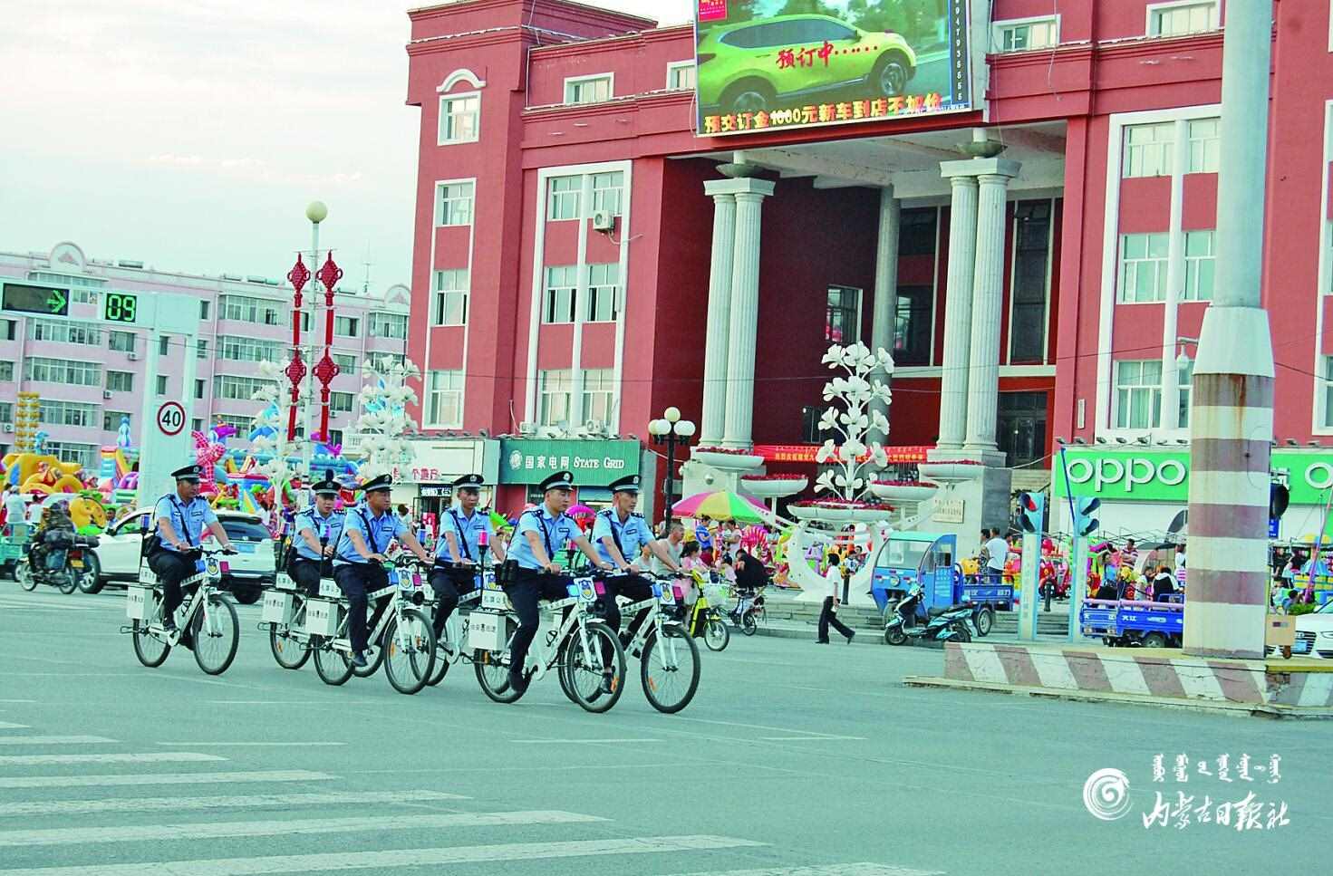 興安盟扎賚特旗公安局民警騎自行車在主干道巡邏。為確保社會(huì)面 安全穩(wěn)定,每晚7點(diǎn)至9點(diǎn),民警上街開展巡邏防控,及時(shí)發(fā)現(xiàn)安全隱患,增 強(qiáng)群眾安全感。 李健 攝
