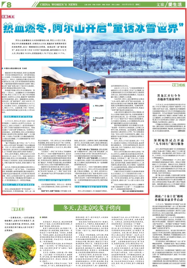 2025年12月2日,《中國婦女報》第8版刊發(fā)題為《熱血燃冬,阿爾山開啟“童話冰雪世界”》的新聞,報道了阿爾山,這座地處內(nèi)蒙古自治區(qū)興安盟的東北小城,近年來憑借獨特的地理優(yōu)勢、豐富的旅游資源和當?shù)卣穆貌块T精心推出的“寵客”政策,吸引了國內(nèi)外大批游客,成為冬季體驗冰雪快樂的打卡地。