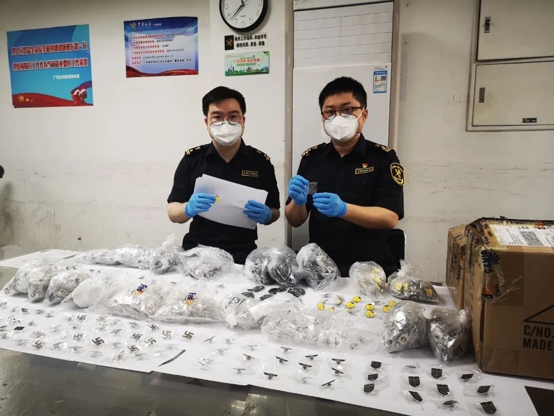 記者5月12日從廣州海關(guān)獲悉,該關(guān)近日在廣州白云機場空港口岸出境快件渠道查獲一批納粹徽章,共9個品種、1881枚。目前,已作進一步處理。