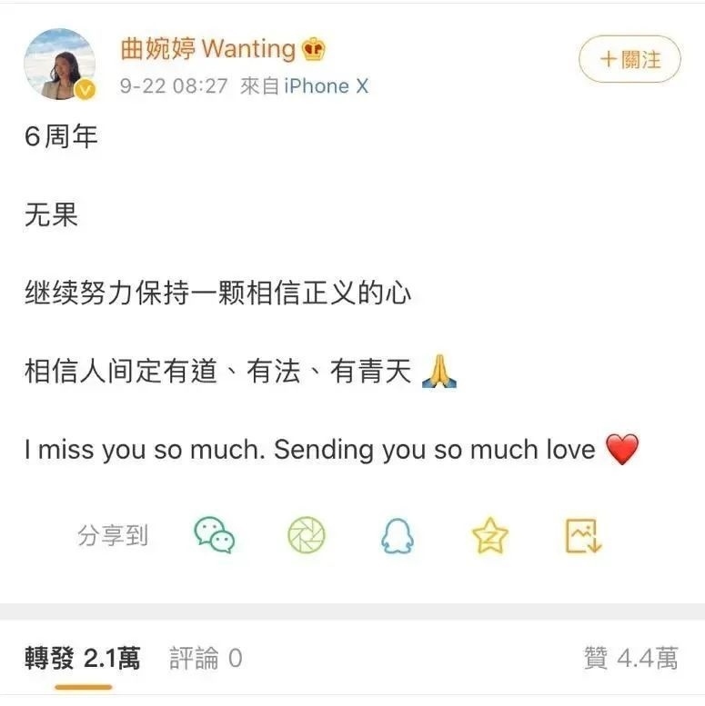 此后,曲婉婷多次在微博發(fā)文,為其母親“喊冤”。