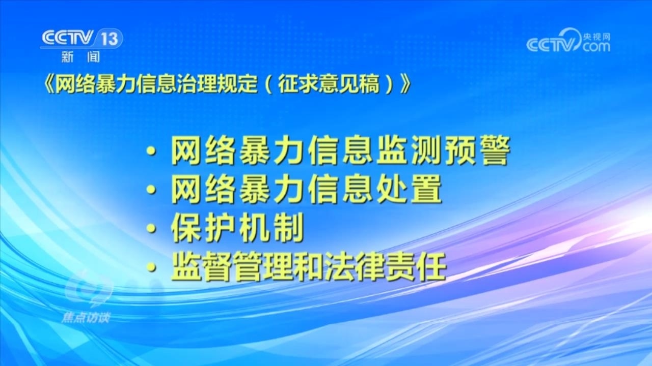 央視網(wǎng)消息(焦點訪談):俗話說“舌上有龍泉,殺人不見血”。網(wǎng)絡(luò)暴力不同于現(xiàn)實中的拳腳相加,但是這些在網(wǎng)絡(luò)空間中用文字、圖片等方式進(jìn)行的傷害和侮辱,一樣可以對當(dāng)事人的現(xiàn)實生活產(chǎn)生惡劣的影響,讓當(dāng)事人的心靈“流血”。在傷害當(dāng)事人的同時,網(wǎng)絡(luò)暴力行為也嚴(yán)重污染了互聯(lián)網(wǎng)環(huán)境,影響社會和諧穩(wěn)定。近日,國家互聯(lián)網(wǎng)信息辦公室起草了《網(wǎng)絡(luò)暴力信息治理規(guī)定(征求意見稿)》,向社會公開征求意見;同樣是針對網(wǎng)絡(luò)暴力,在6月,最高人民法院、最高人民檢察院、公安部起草了《關(guān)于依法懲治網(wǎng)絡(luò)暴力違法犯罪的指導(dǎo)意見(征求意見稿)》,面向社會公開征求意見。治理網(wǎng)絡(luò)暴力這顆“毒瘤”,營造良好生態(tài)勢在必行。