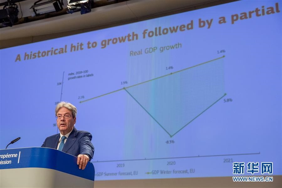 這是7月7日,負(fù)責(zé)經(jīng)濟(jì)事務(wù)的歐委會(huì)委員保羅·真蒂洛尼在位于比利時(shí)布魯塞爾的歐盟委員會(huì)總部就歐盟經(jīng)濟(jì)預(yù)測(cè)出席新聞發(fā)布會(huì)。歐盟7日發(fā)布夏季經(jīng)濟(jì)預(yù)測(cè)報(bào)告說,由于放松新冠疫情防控措施的步伐比原計(jì)劃緩慢,歐盟和歐元區(qū)今年經(jīng)濟(jì)萎縮程度將比此前預(yù)期更嚴(yán)重,明年復(fù)蘇也將更緩慢。新華社發(fā)(歐盟供圖)