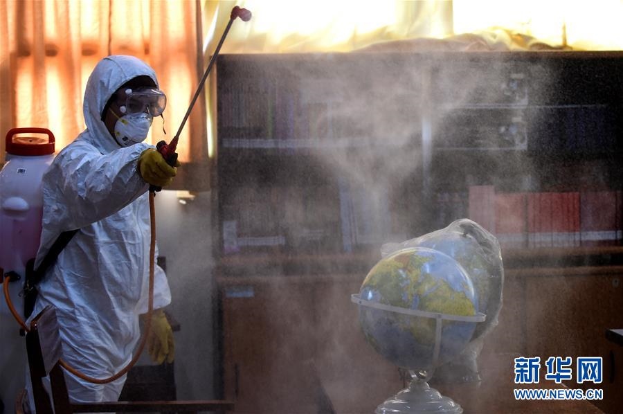 3月20日,工作人員在印度尼西亞雅加達(dá)的一所學(xué)校進(jìn)行消毒。新華社發(fā)(阿貢攝)