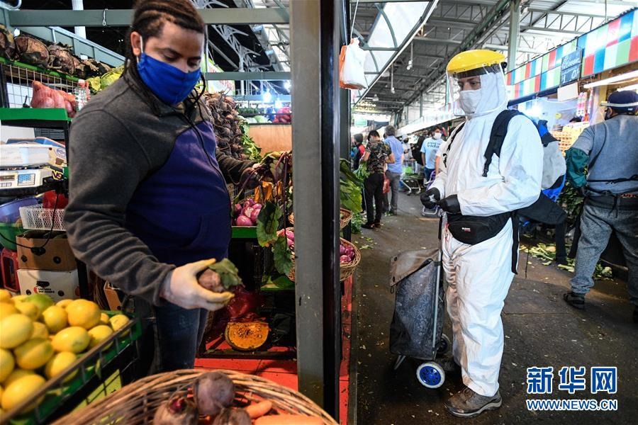 這是4月16日,身穿防護(hù)服的顧客在智利圣地亞哥拉貝加中心市場(chǎng)采購。新華社發(fā)(豪爾赫·比列加斯攝)