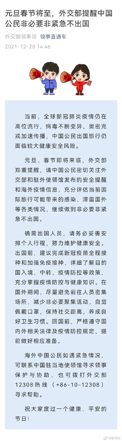 元旦春節(jié)將至,外交部提醒中國(guó)公民非必要非緊急不出國(guó)