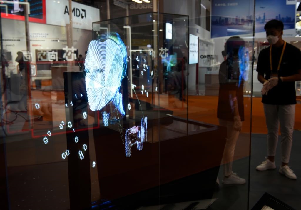 這是2021年11月5日在第四屆進(jìn)博會(huì)技術(shù)裝備展區(qū)SK海力士展臺(tái)拍攝的芯片應(yīng)用展示。新華社記者徐亮攝