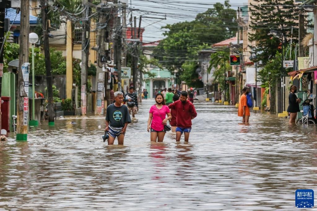 10月30日,人們在菲律賓甲米地省被洪水淹沒的街道上前行。新華社發(fā)(烏馬利攝)