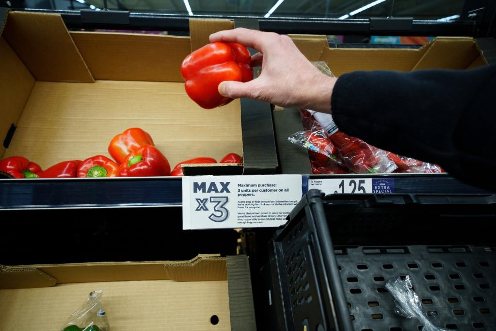 這是2月23日在英國曼徹斯特一家超市拍攝的蔬菜貨架上的限購?fù)ㄖ?。按照通知,每名顧客一次只能最多購買3個彩椒。新華社發(fā)(喬恩·休珀攝)