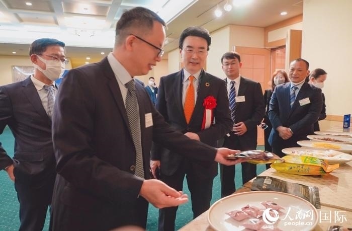 廣西經(jīng)貿(mào)代表團與日本國際貿(mào)易促進協(xié)會進行現(xiàn)場交流。人民網(wǎng) 滕雪攝