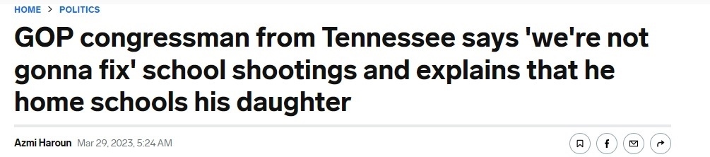 據(jù)美國《商業(yè)內(nèi)幕》新聞網(wǎng)站29日報(bào)道,田納西州納什維爾市小學(xué)發(fā)生槍擊事件后,該州眾議院議員蒂姆·伯切特面對如果出現(xiàn)類似槍擊事件“該如何保護(hù)孩子”的質(zhì)問,直言并未找到解決方法,會讓他的女兒“在家讀書”。