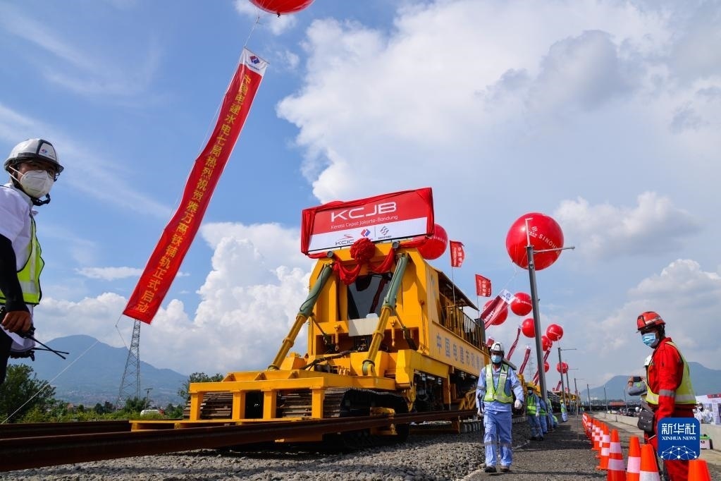 工作人員在印度尼西亞萬隆雅萬高鐵鋪軌施工現(xiàn)場作業(yè)(2022年4月20日攝)。新華社記者 徐欽 攝