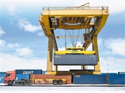 一輛貨車在滿洲里站貨運車間集裝箱場裝卸集裝箱。滿洲里口岸是中國最大的陸路口岸,也是中歐班列東通道進(jìn)出境重要口岸。新華社記者 貝 赫攝