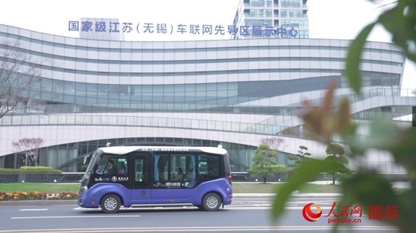 行駛在無錫車聯(lián)網小鎮(zhèn)的無人駕駛小巴車。人民網記者 劉寧 攝