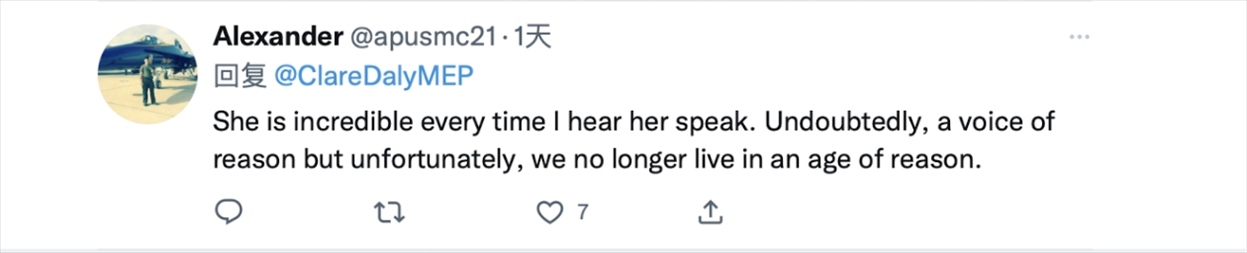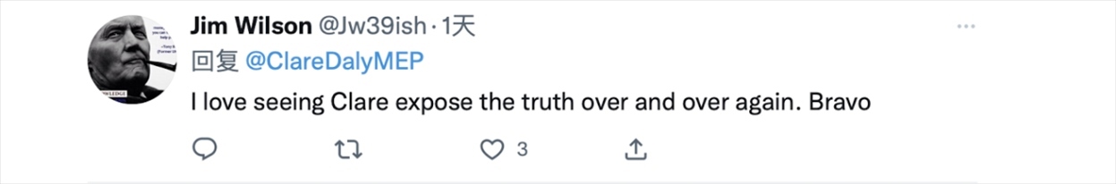 克萊爾·戴利的推文正是她在歐洲議會發(fā)言中所提到的內(nèi)容。在視頻中,克萊爾·戴利首先抨擊了西方對華問題上的雙標(biāo)行為。她在發(fā)言時(shí)稱,“人們在暴露分裂的同時(shí)談?wù)撝鴪F(tuán)結(jié),他們一邊在歐盟向?yàn)蹩颂m提供武器,一邊與中國談?wù)摵推?。他們哀嘆中國在臺灣地區(qū)‘挑釁’,但對美國干涉國際公認(rèn)的中國領(lǐng)土卻只字未提。”