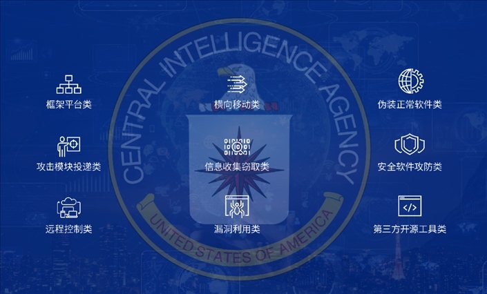 國家病毒應急處理中心和360公司通過進一步技術分析發(fā)現(xiàn),盡管CIA的后門程序和攻擊組件大都以無實體文件的內(nèi)存駐留執(zhí)行的方式運行,這使得對相關樣本的發(fā)現(xiàn)和取證難度極大。即使這樣,聯(lián)合技術團隊還是成功找到了解決取證難題的有效方法,發(fā)現(xiàn)了CIA所使用的9個類別的攻擊武器,包括攻擊模塊投遞類、遠程控制類、信息收集竊取類、第三方開源工具類等。