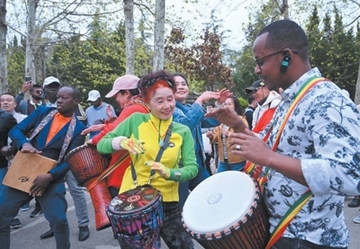 4月22日,在山東青島八大關(guān)街道,非洲青年代表與當(dāng)?shù)厣鐓^(qū)文藝隊成員熱情互動。本報記者 陳尚文攝