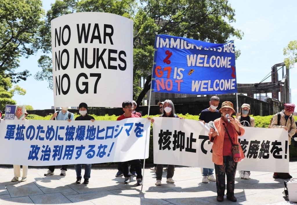 5月14日,在日本廣島街頭,日本民眾舉著“不要戰(zhàn)爭、不要核武器、不要G7”等標(biāo)語,強(qiáng)烈抗議七國集團(tuán)(G7)峰會(huì)將在廣島召開。新華社記者楊光攝