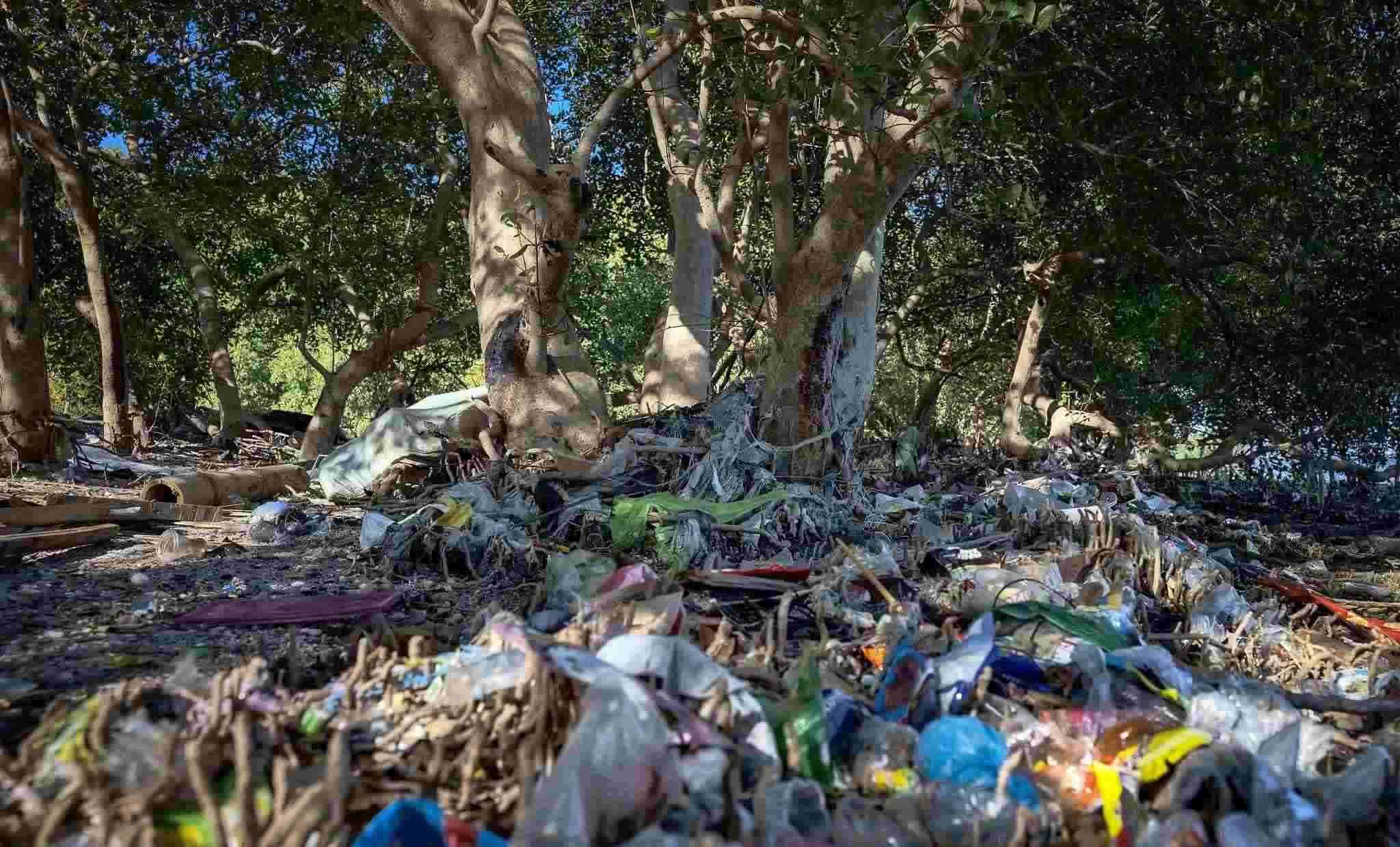 當(dāng)?shù)貢r(shí)間2023年4月19日,菲律賓馬尼拉,帕拉納克,自由島紅樹(shù)林上的塑料垃圾。