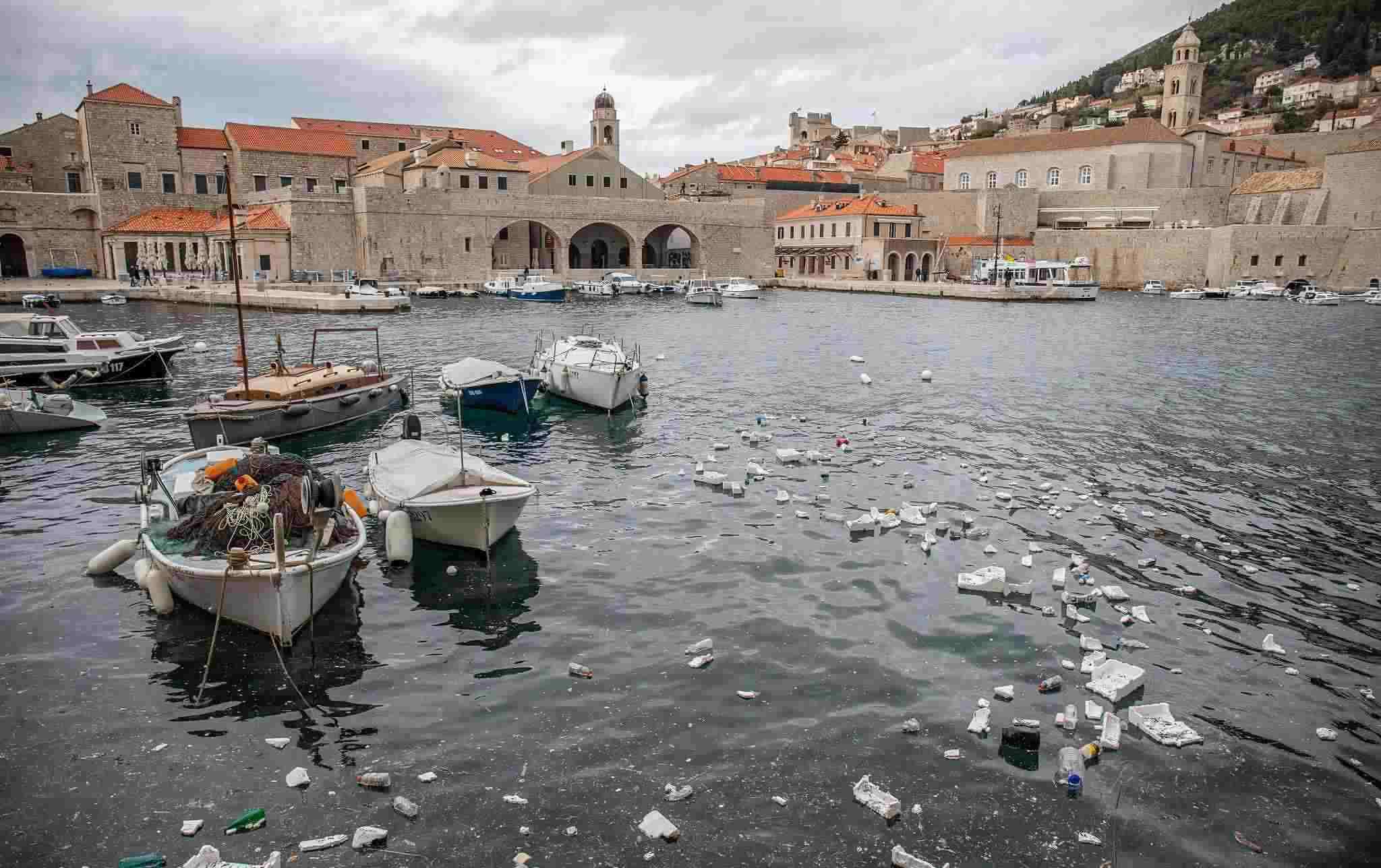 當(dāng)?shù)貢r(shí)間2023年2月27日,克羅地亞杜布羅夫尼克,大風(fēng)過(guò)后,塑料垃圾漂浮在舊城港口。