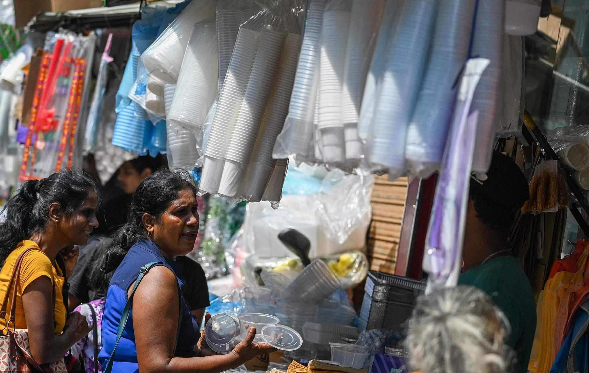 當(dāng)?shù)貢r(shí)間2023年2月14日,斯里蘭卡科倫坡市場(chǎng)的一家商店里,顧客在購(gòu)買塑料餐具。