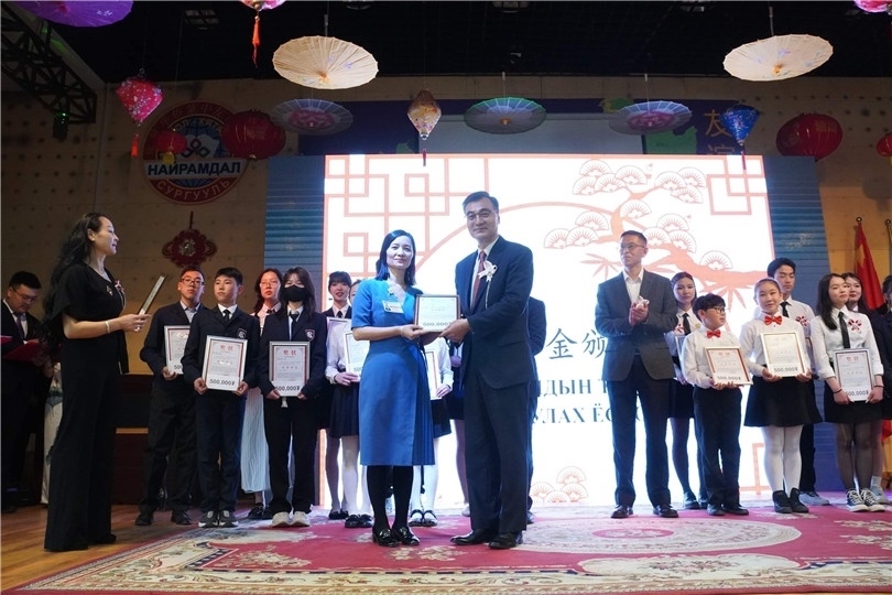 柴文睿大使為旅蒙華僑蒙中友誼學(xué)校優(yōu)秀生頒發(fā)大使獎(jiǎng)學(xué)金。學(xué)校供圖