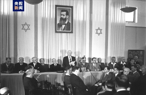 △1948年5月,以色列首任總理本·古里安宣讀以色列《獨(dú)立宣言》。