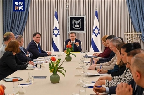 △以色列總統(tǒng)赫爾佐格主持各政黨政治磋商會議。