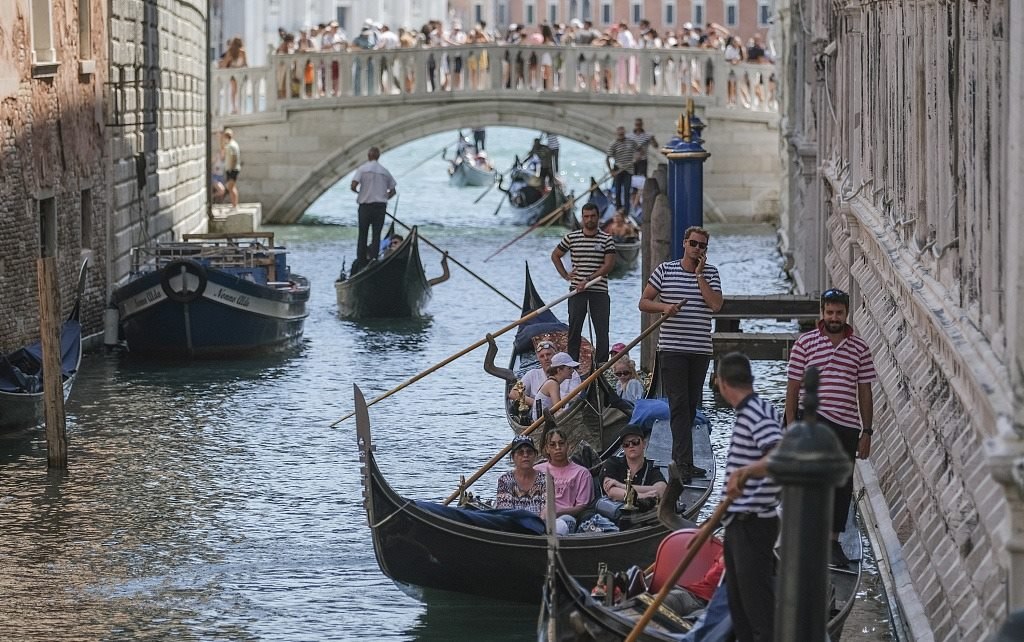 當(dāng)?shù)貢r間2023年8月2日,意大利威尼斯,交通擁擠,船夫們在索斯皮里橋附近緩慢前行。