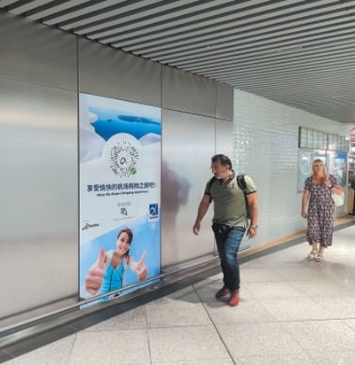 希臘雅典國際機場內,旅客走過用中文書寫的廣告海報。本報記者 謝亞宏攝