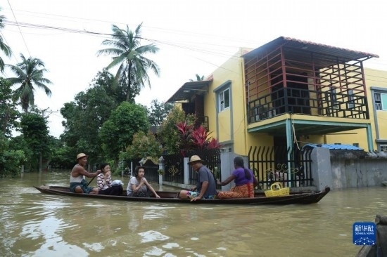 8月12日,在緬甸勃固鎮(zhèn)洪災(zāi)區(qū),人們乘船出行。新華社發(fā)(苗覺梭攝)