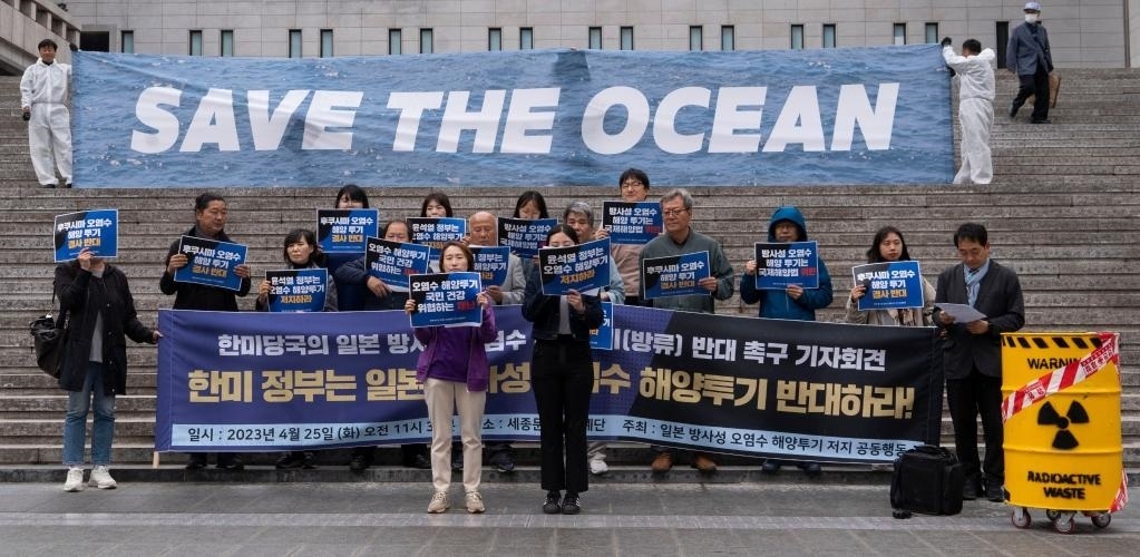 4月25日,在韓國首爾,民眾手舉標(biāo)語抗議日本政府核污染水排海計劃。新華社發(fā)(李相浩攝)