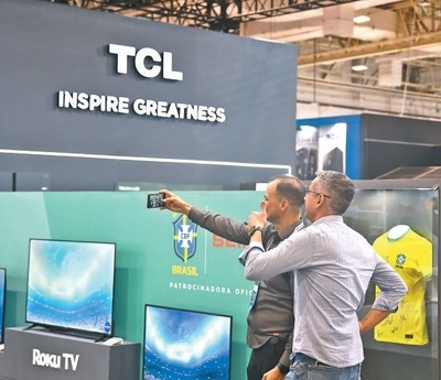 在2023年圣保羅國際消費類電子及家用電器產(chǎn)品展覽會上,參觀者在TCL展臺前合影留念。本報記者 時元皓攝