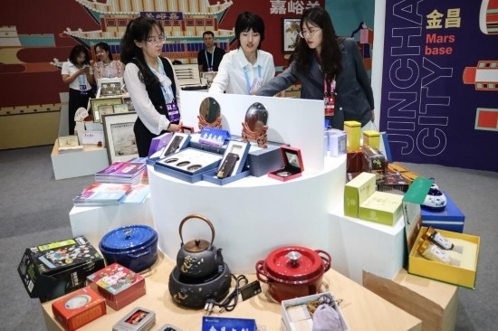 9月6日,與會嘉賓在第六屆絲綢之路(敦煌)國際文化博覽會上參觀文創(chuàng)產(chǎn)品和文旅裝備展銷活動。新華社記者 馬希平 攝