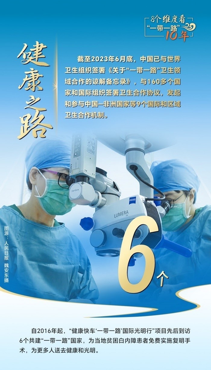 截至2023年6月底,中國(guó)已與世界衛(wèi)生組織簽署《關(guān)于“一帶一路”衛(wèi)生領(lǐng)域合作的諒解備忘錄》,與160多個(gè)國(guó)家和國(guó)際組織簽署衛(wèi)生合作協(xié)議,發(fā)起和參與中國(guó)—非洲國(guó)家、中國(guó)—阿拉伯國(guó)家、中國(guó)—東盟衛(wèi)生合作等9個(gè)國(guó)際和區(qū)域衛(wèi)生合作機(jī)制。為共建國(guó)家培養(yǎng)數(shù)萬(wàn)名衛(wèi)生管理、公共衛(wèi)生、醫(yī)學(xué)科研等專業(yè)人才,向58個(gè)國(guó)家派出中國(guó)醫(yī)療隊(duì),赴30多個(gè)國(guó)家開(kāi)展“光明行”,免費(fèi)治療白內(nèi)障患者近萬(wàn)名,與湄公河流域國(guó)家、中亞國(guó)家、蒙古國(guó)等周邊國(guó)家開(kāi)展跨境醫(yī)療合作,衛(wèi)生健康合作成效顯著。