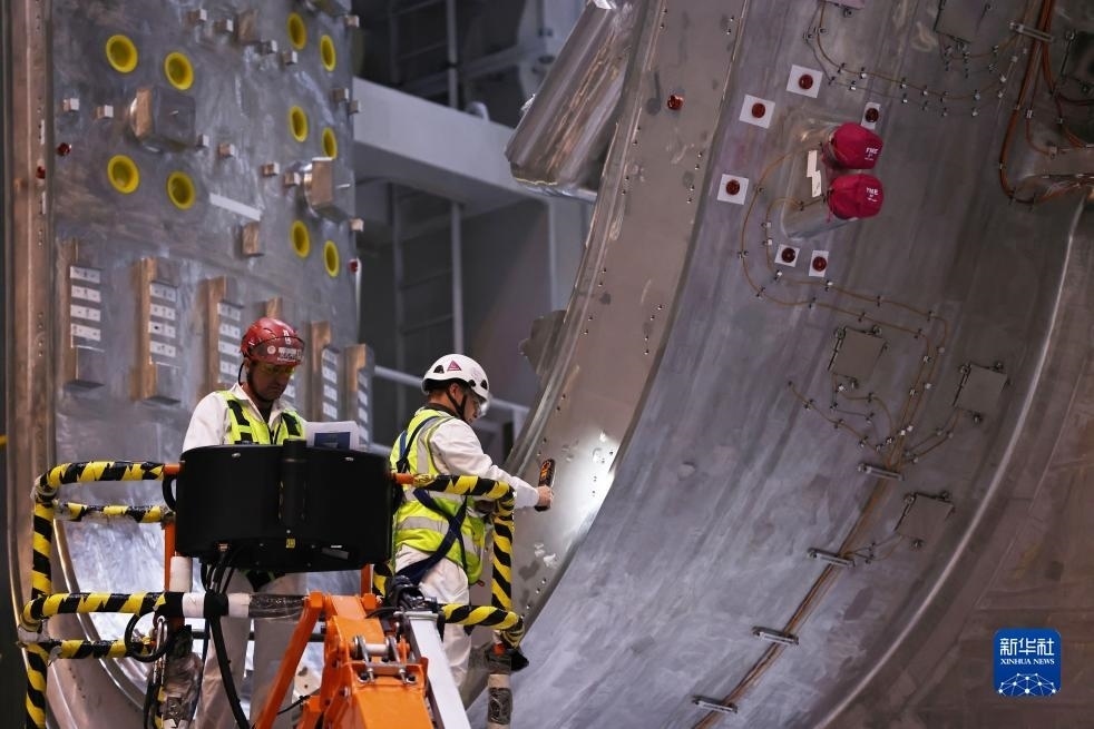 11月24日,在位于法國(guó)圣保羅-萊迪朗斯的國(guó)際熱核聚變實(shí)驗(yàn)反應(yīng)堆(ITER)預(yù)組裝大廳里,高高的吊架上懸著一個(gè)超大豌豆形金屬設(shè)備,吊斗里的技術(shù)人員正在對(duì)它進(jìn)行檢查。新華社記者 高靜 攝