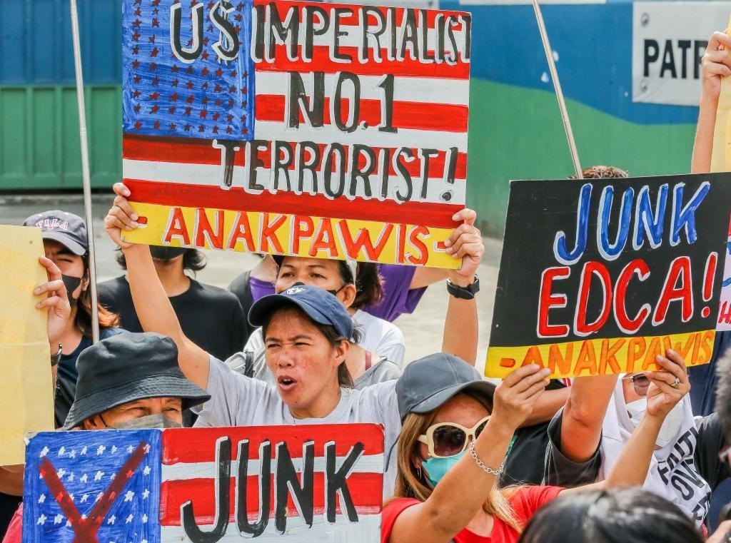 2023年4月11日,在菲律賓首都大馬尼拉地區(qū)奎松城,民眾參加集會活動,抗議菲律賓和美國軍方舉行聯(lián)合軍事演習(xí)。菲律賓和美國軍方當(dāng)天在菲首都馬尼拉啟動為期18天的2023年度“肩并肩”聯(lián)合軍事演習(xí)。新華社發(fā)(烏馬利攝)