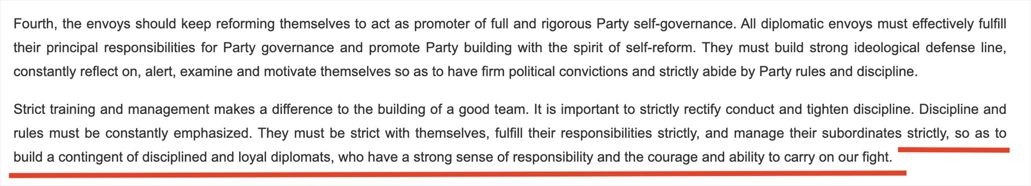 “鐵軍”一詞常見于政府文件或領(lǐng)導(dǎo)人講話,更多的是強調(diào)工作作風(fēng)和紀(jì)律。在近年來中國領(lǐng)導(dǎo)人講話中,曾多次出現(xiàn)“紀(jì)律監(jiān)察鐵軍”“生態(tài)環(huán)境保護鐵軍”等表述。中國領(lǐng)導(dǎo)人在接見與會使節(jié)時的講話中說:“打造一支對黨忠誠、勇于擔(dān)當(dāng)、敢斗善斗、紀(jì)律嚴(yán)明的外交鐵軍?!蓖饨徊烤W(wǎng)站對這句話的英文翻譯(見下圖)同樣強調(diào)外交隊伍的紀(jì)律、責(zé)任和勇氣。作為通行做法,世界各國對本國外交人員都有著很高的紀(jì)律要求。
