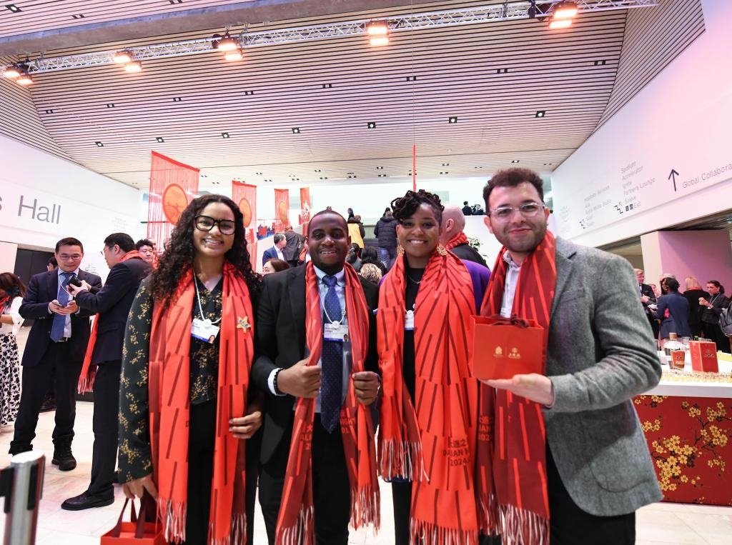 1月16日,在瑞士達(dá)沃斯,與會者在“大連之夜”招待會上合影。新華社記者連漪攝