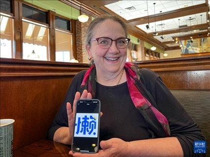 1月9日,在美國(guó)得克薩斯州達(dá)拉斯,朱麗葉·托馬斯用手機(jī)展示她的微信頭像“懶”字,意在提醒所有人監(jiān)督她學(xué)中文要勤奮,不要偷懶。新華社發(fā)(田丹攝)
