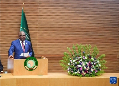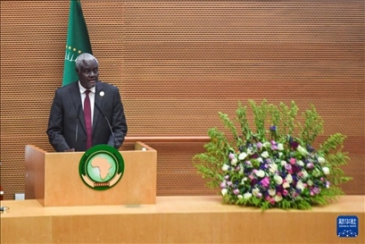 2月17日,在埃塞俄比亞首都亞的斯亞貝巴,非盟委員會(huì)主席法基在開幕式上發(fā)言。新華社發(fā)(邁克爾·特韋爾德攝)