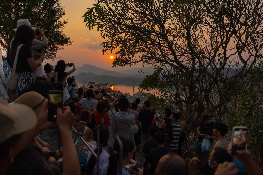 2月16日,在老撾瑯勃拉邦普西山山頂,游客在觀賞落日景觀。湄公河畔、老撾北部群山環(huán)繞的瑯勃拉邦在14到16世紀(jì)間曾是老撾歷史上第一個統(tǒng)一的多民族國家瀾滄王國的首都?,槻罟懦?995年被聯(lián)合國教科文組織列入世界文化遺產(chǎn),如今已經(jīng)成為老撾歷史與文化的象征。