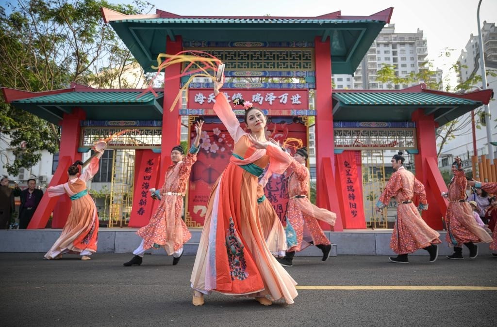 2月12日,在位于海南省??谑械牡谑鶎萌f春會分會場——海瑞文化公園春節(jié)系列活動中拍攝的舞蹈演藝現(xiàn)場。新華社記者蒲曉旭攝