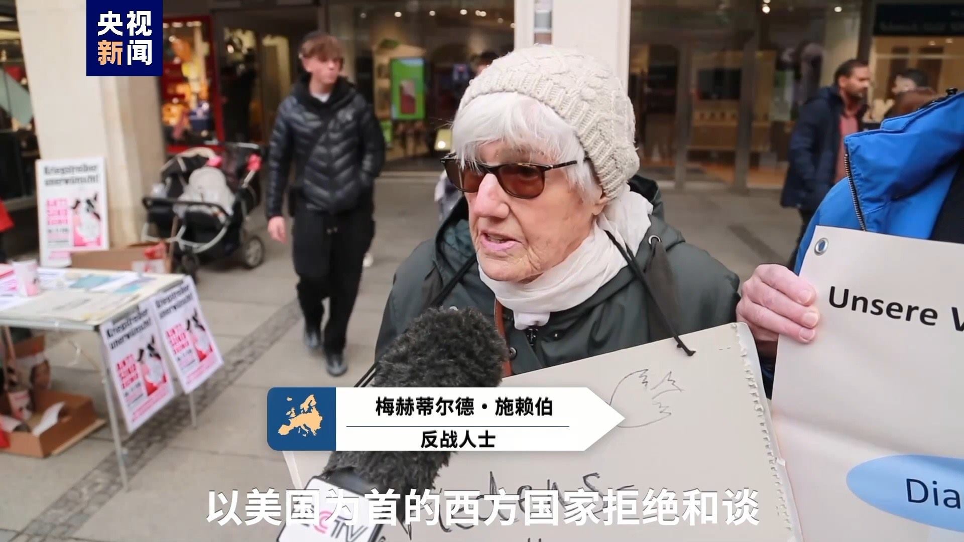 反戰(zhàn)人士 梅赫蒂爾德·施賴(lài)伯:以美國(guó)為首的西方國(guó)家拒絕和談。德國(guó)國(guó)防部長(zhǎng)說(shuō),我們必須做好戰(zhàn)爭(zhēng)準(zhǔn)備,運(yùn)送武器并且提高武器生產(chǎn)能力。這非??膳?。