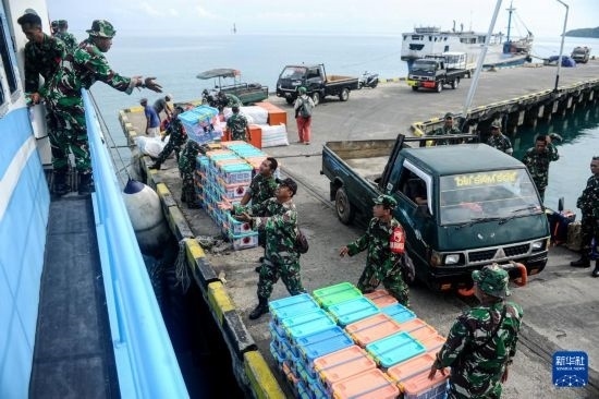 3月25日,在印度尼西亞巴韋安島,印尼軍人搬運印尼國家災害管理局發(fā)放的救援物資。