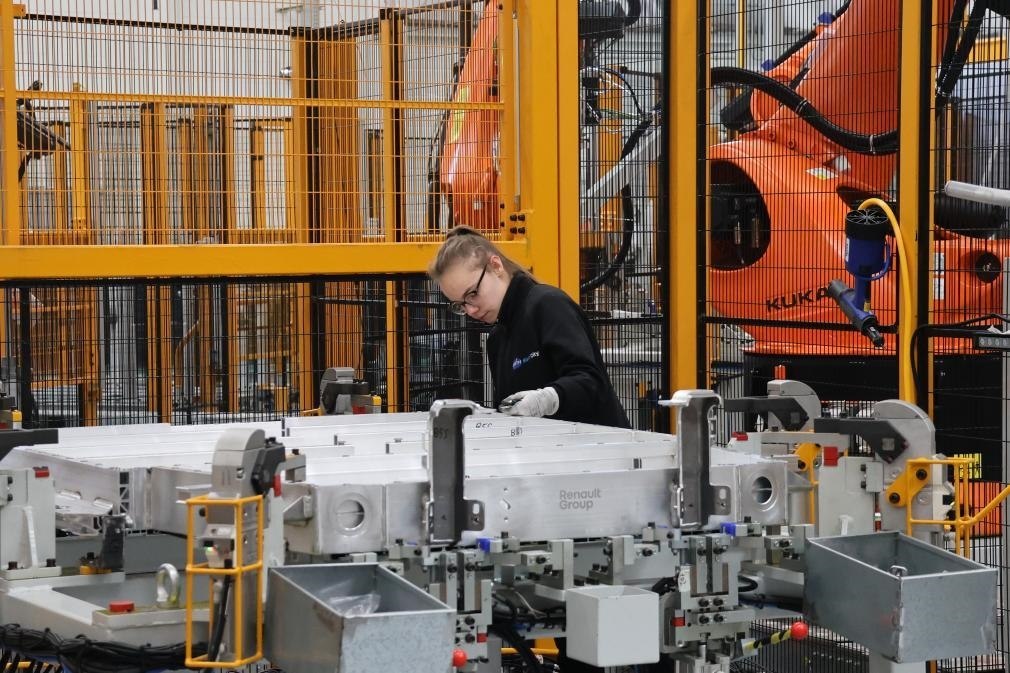 ?2月23日,在法國呂茨,中國敏實集團(tuán)與法國雷諾集團(tuán)成立的合資公司的員工在電池盒產(chǎn)線上工作。新華社記者張百慧攝