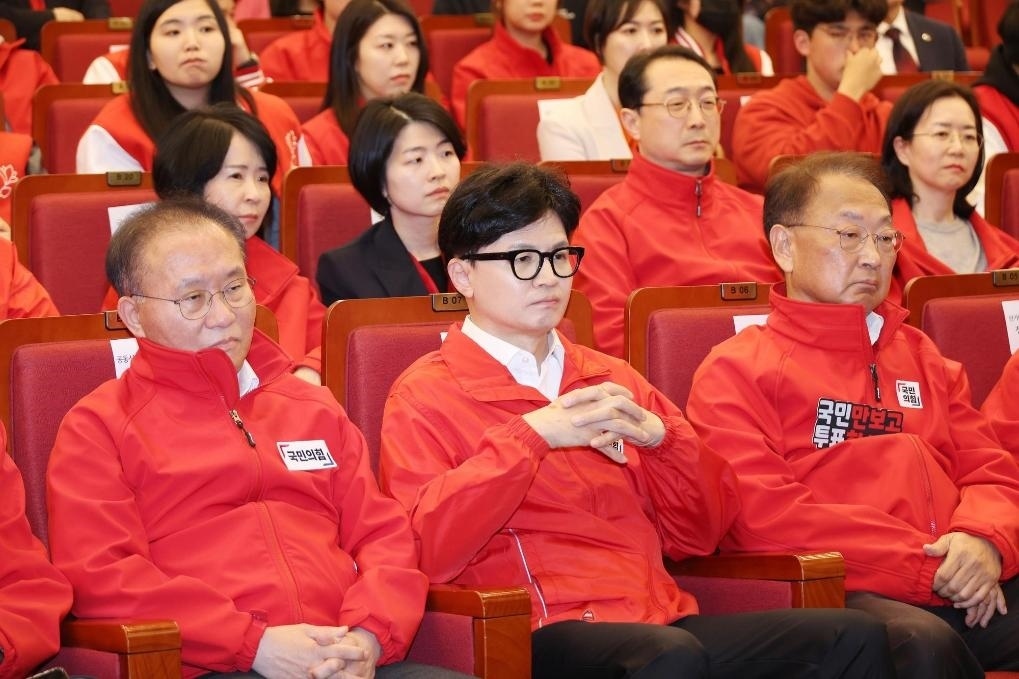 4月10日,在韓國首爾,國民力量黨領(lǐng)導(dǎo)人韓東勛(前排中)觀看出口民調(diào)。新華社/紐西斯通訊社
