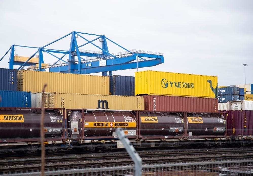 貨輪排隊???,火車鳴笛駛?cè)胴涍\(yùn)場站,卡車搭載著印有“渝新歐”“義新歐”“西安港”等字樣的集裝箱往來奔馳……這座萊茵河畔的港口,一派繁忙景象。