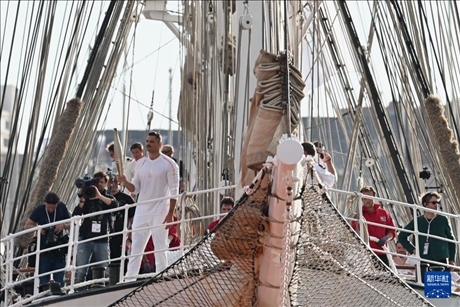 傍晚時分,伴隨著現(xiàn)場觀眾高唱法國國歌《馬賽曲》,“貝勒姆”號緩緩駛進港口,著名的“法蘭西巡邏兵”飛行表演隊從港口上空呼嘯而過,先后展示了奧運五環(huán)與法國國旗的圖案。